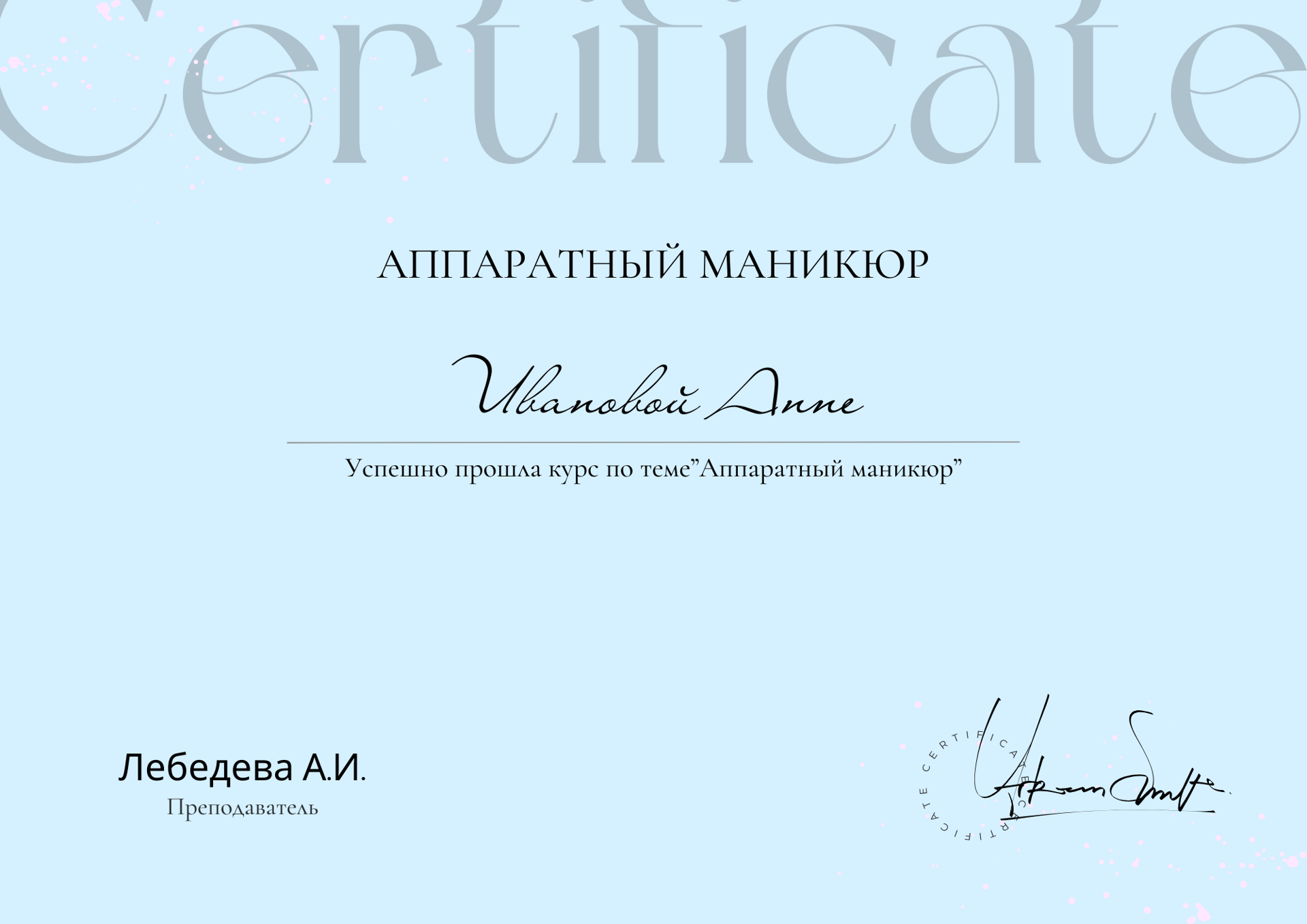Хочу выразить отдельную благодарность преподавателю Анне! Весь учебный процесс проходил в приятной обстановке. Анастасия мастер своего дела, всегда подскажет и поможет.Хотелось бы добавить что школа отличная, но бывают трудности с записями на практические занятия из-за большого количества учеников.